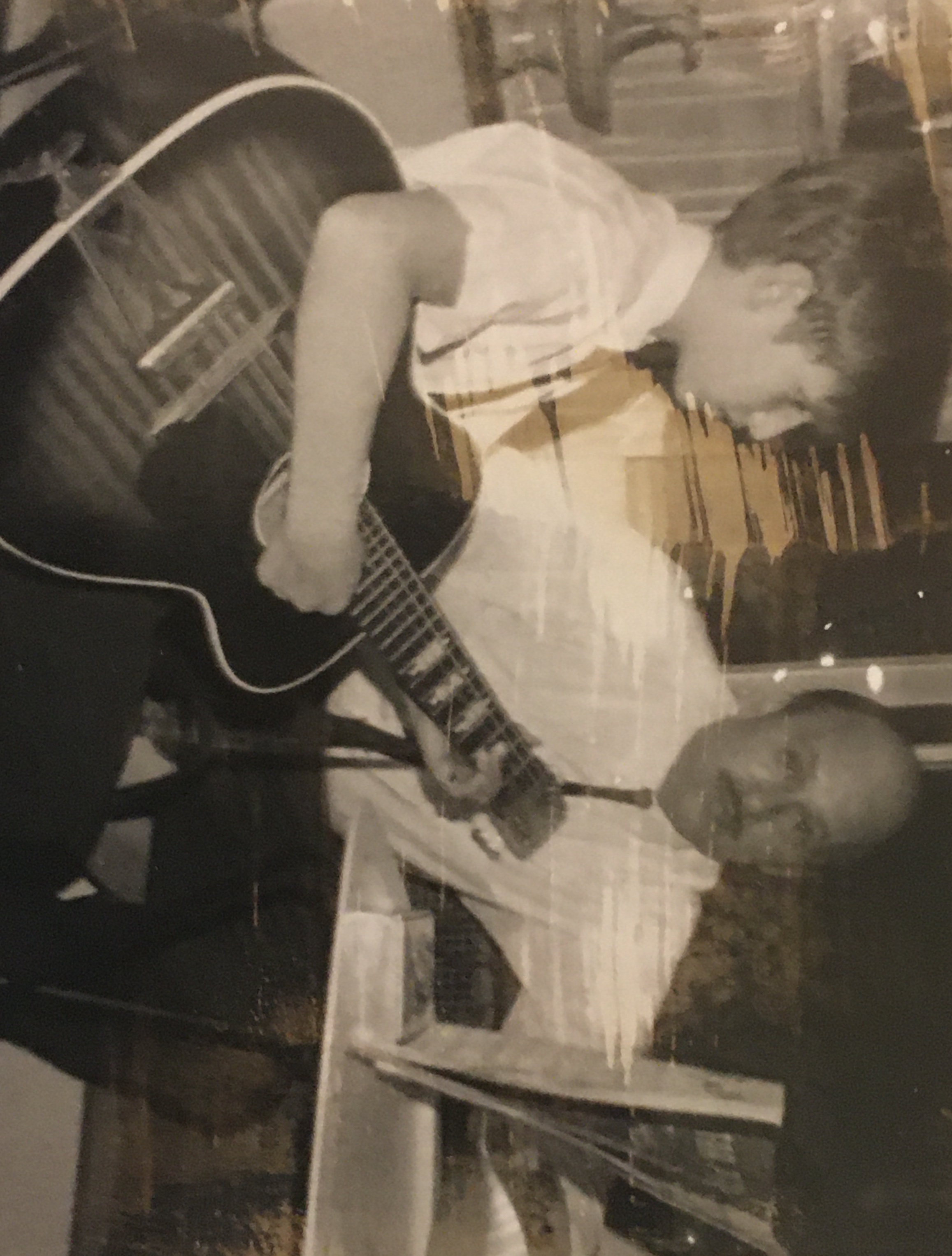 Jeff, at age 9, playing music on his guitar, with his Dad next to him, at a family get-together.