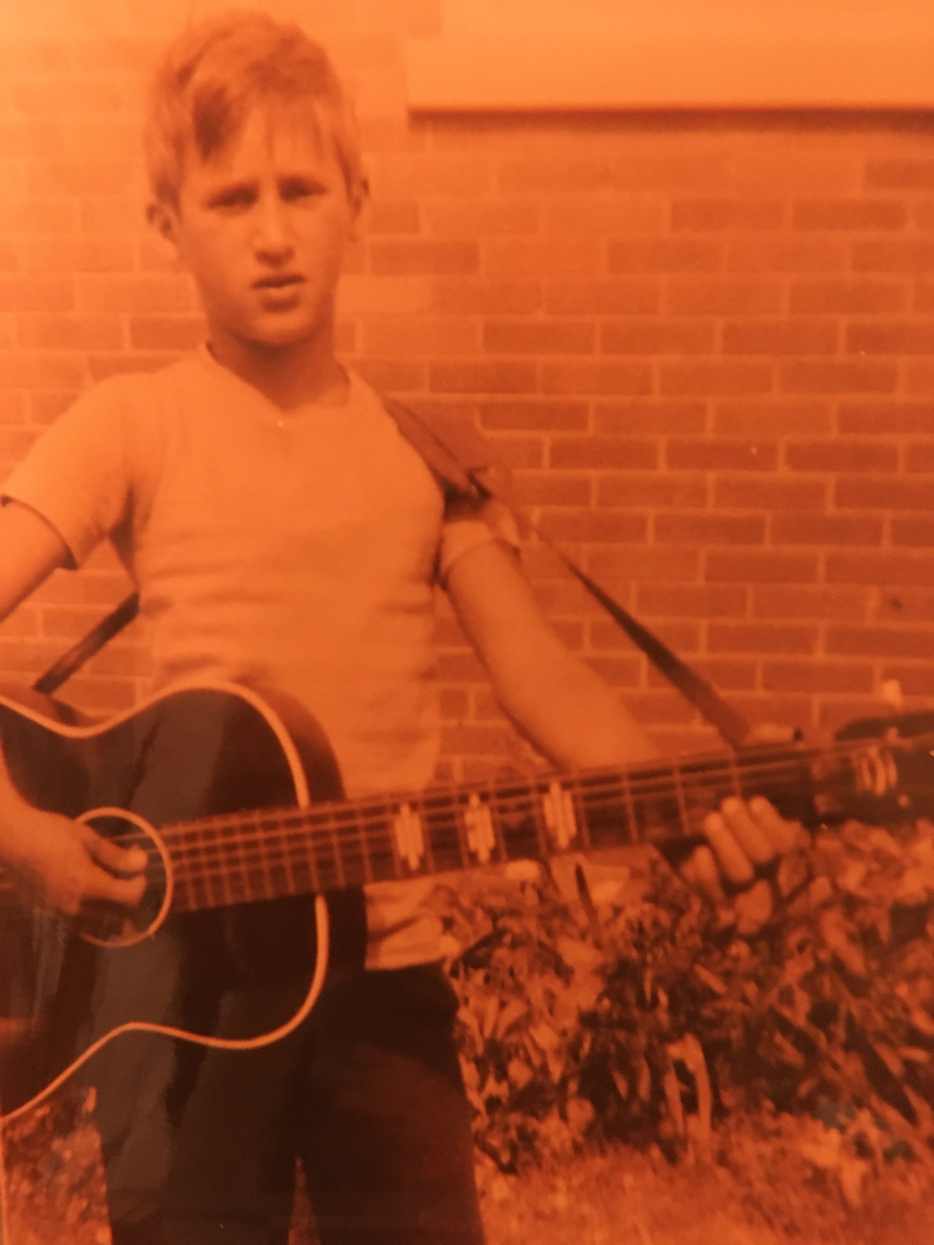 Photo of "Jazzman" Jeff Justman playing his first guitar when he was 9 years old!